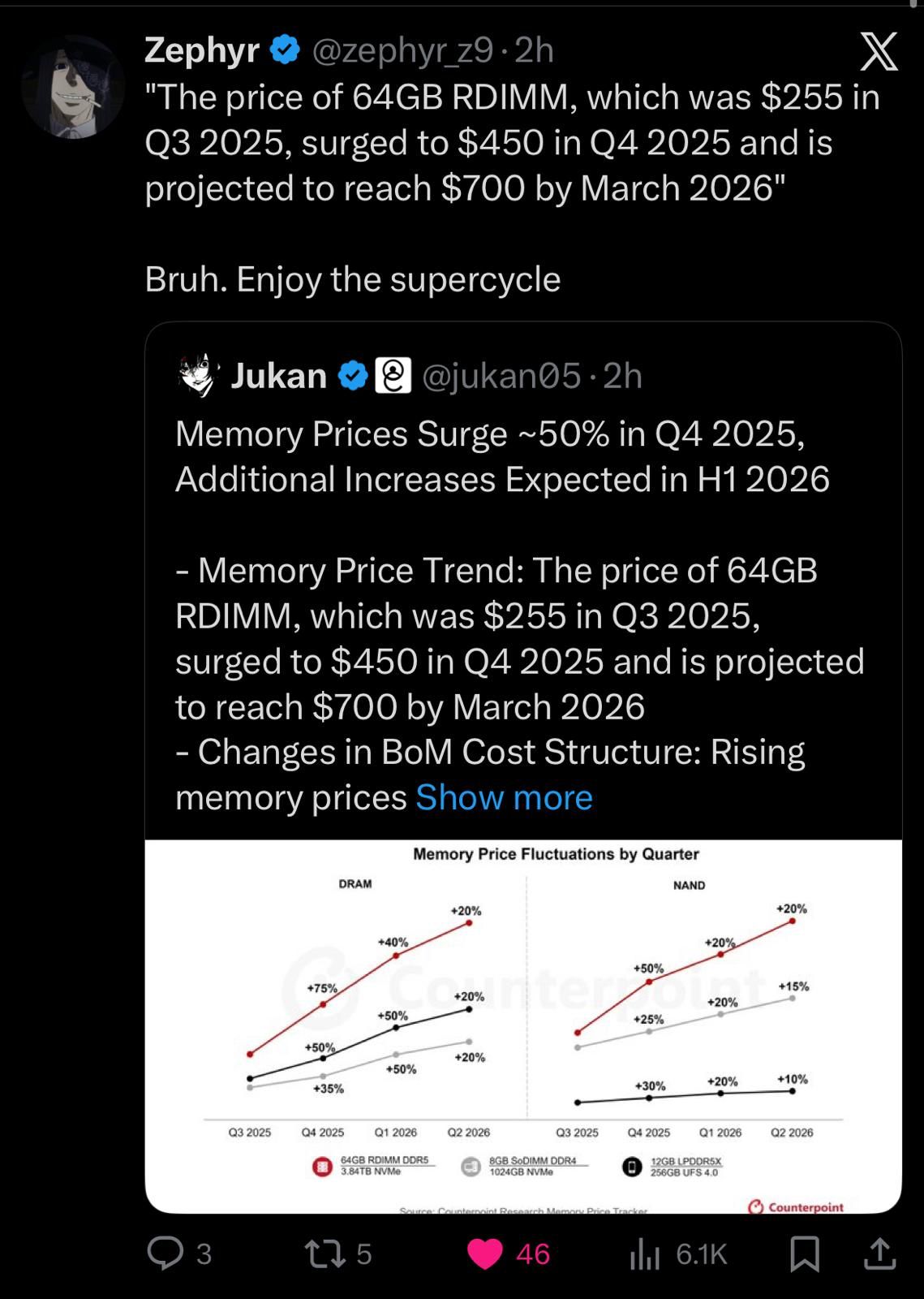 Or take Sk Hynix which is my favourite stock. In September last year, just 3 months ago, it was trading at ~$260/share. It is currently trading at $760/share. This company supplies 60+% of NVIDIA’s HBM (high bandwidth memory).